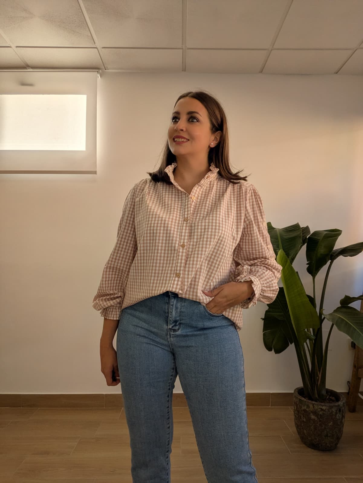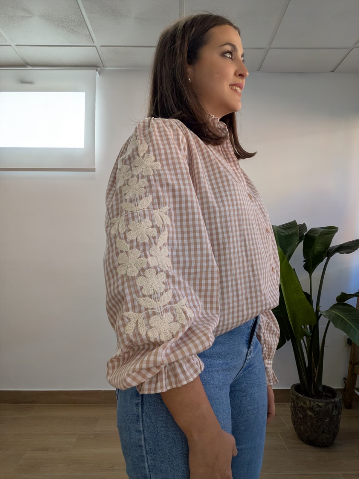 Blusa de manga larga con el clásico estampado de cuadros vichy en un suave tono beige arena y blanco.