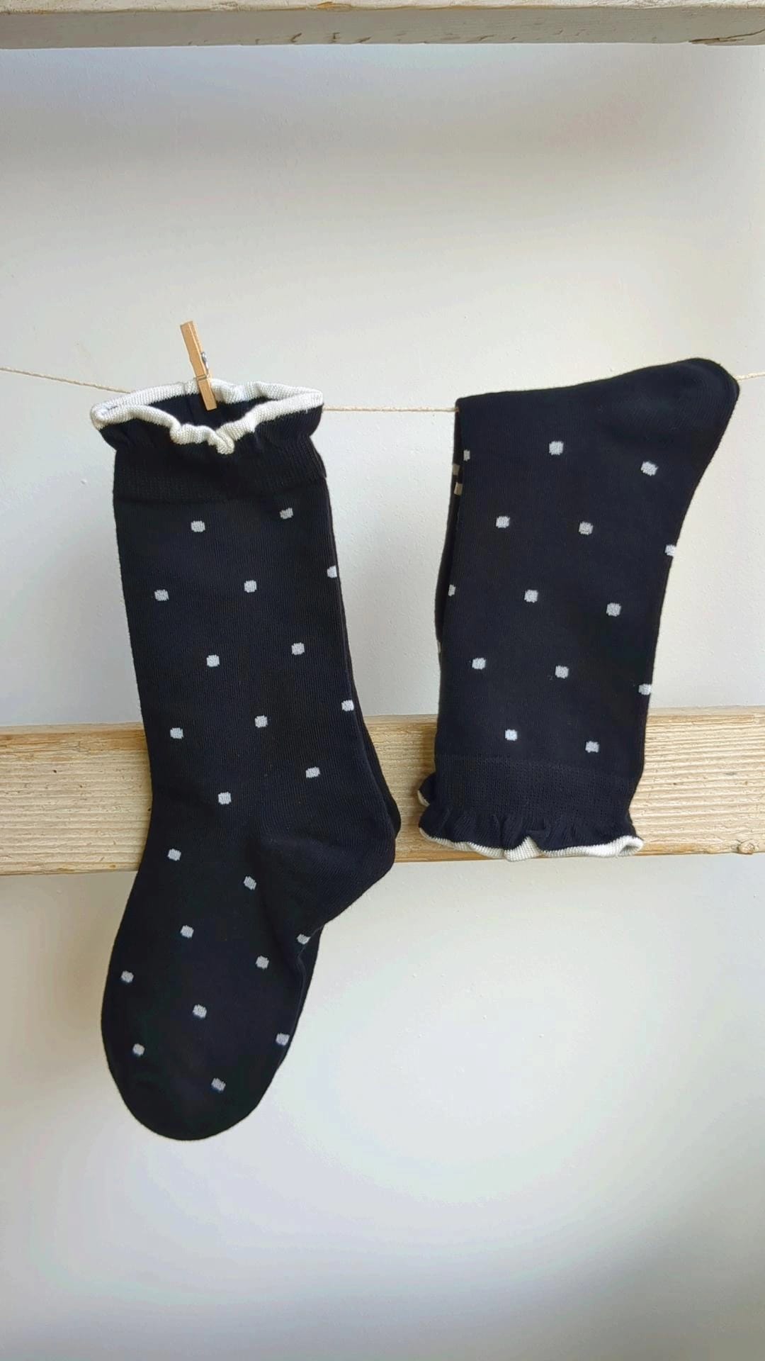Calcetín Negro de Topos con Volante Blanco