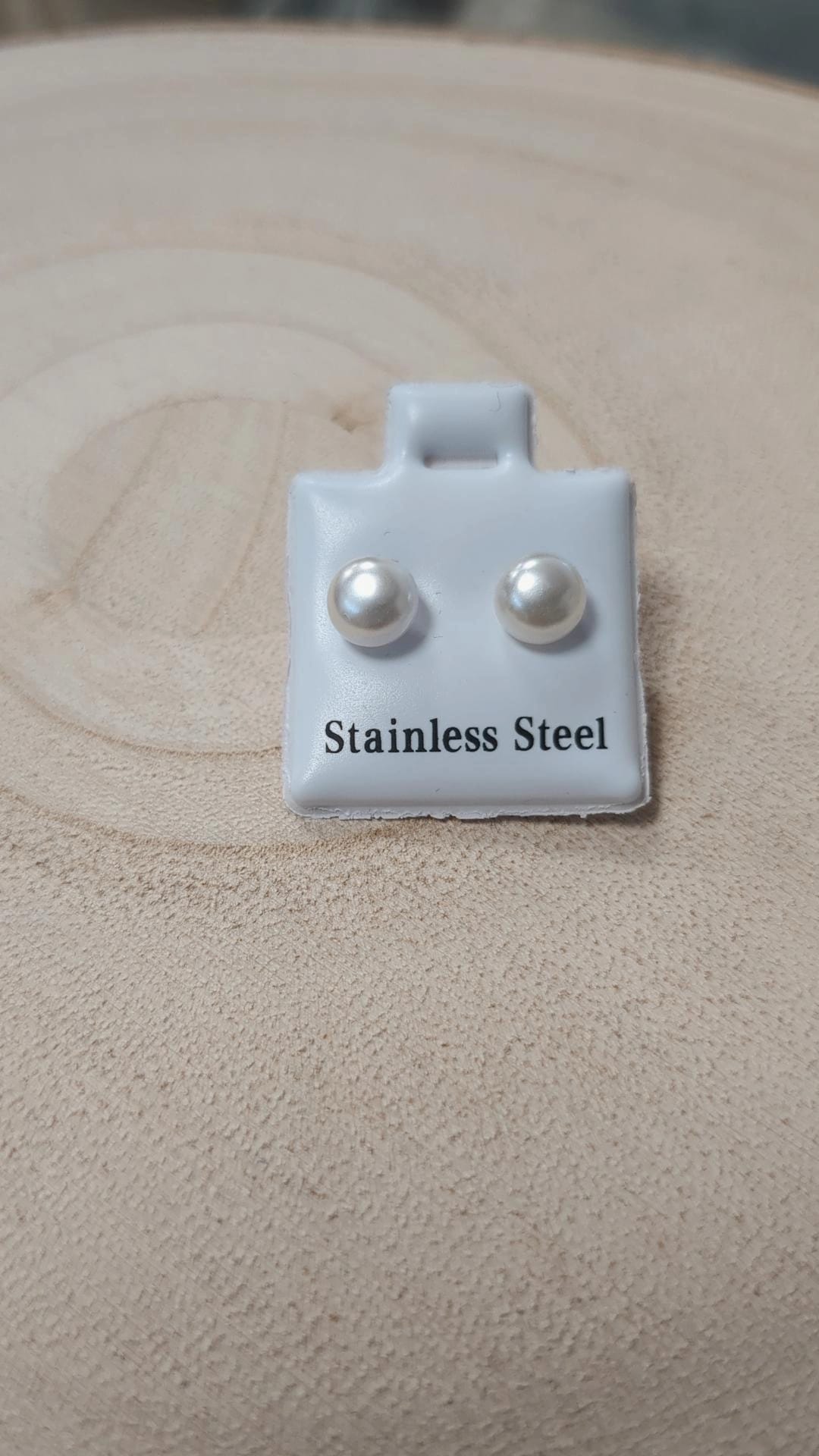 Pendientes de perlas blanca con base de acero inoxidable quirúrgico. (6mm)